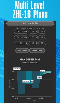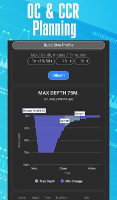 DiveProMe+ calculates all types of Nitrox, Trimix, TriOx, HeliOx, OC and multilevel dives. DiveProMe+ makes plans for Lost deco gas, Range plans, watches and alerts. It is designed to allow you to compare several scenario, while optimizing your parameters and gas mixes. Includes Gas Mixer (under early development state), Layouts for saving complex dive plans, PDF and XLS Export, Graphs and Charts, data automation export, etc. The settings allow for customized deep and extended stops, control stop times.