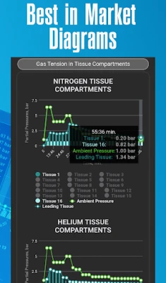 Complete Charts of Diving Profile, Gas Pressures and Compartment Pressures(Tissue Plots). Plenty of nice solid and colored curves
