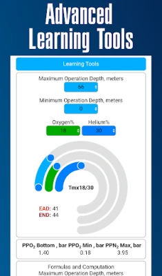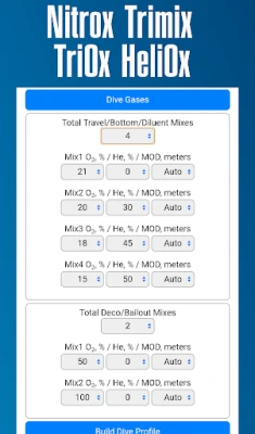 Supports Air to TriMix (any combination of O2/He/N2), with an unlimited number of decompression gases. Includes Thirds support for planning dives