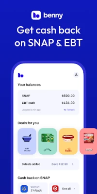 Get cash back on your EBT SNAP (food stamps) with the Benny App. Check your EBT balances easily. Find additional rewards and cash back offers from stores near you.