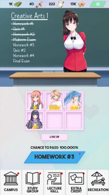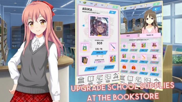 Manage your study group to make full use of the students’ abilities. Guide your study group through the classroom, recreation, and extracurricular activities. Level up and equip your students to make sure they’re living up to their full academic potential. Complete daily tasks to ensure you’re on track to meet your academic goals.