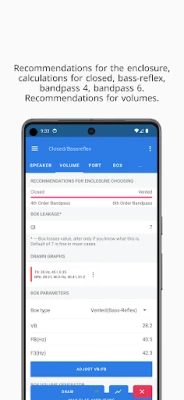 This app is designed for beginners and advanced fans of acoustic system building. The main feature is a calculation of the volume of the subwoofer box, according to his parameters Thiele-Small(FS, VAS, QTS). This is a list of features for box calculations: