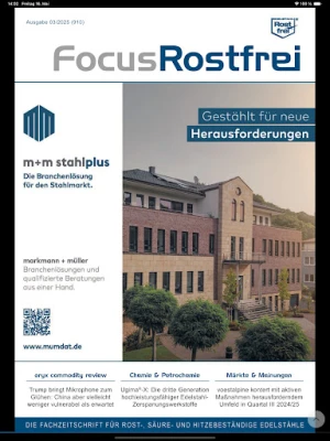 FocusRostfrei ist die einzige deutschsprachige Fachzeitschrift, die über sämtliche Aspekte des Marktes für rost-, säure- und hitzebeständige Edelstähle informiert. Sie gilt als das Sprachrohr der deutschen und europäischen Edelstahl-Industrie.